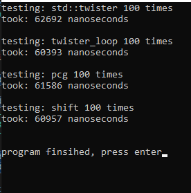 For some reason, I became concerned about the amount of time being spent by random number generators, so I took a look into them. I wrote a program which compares the speed of std::mt19937 ( mersenne twister ), a custom “twister loop”, a custom “pcg”, and custom “xorshift” generators. The standard twister was the slowest, though I’m unsure if it matters since they’re all quite fast. The fastest turned out to be my “twister loop”, though, this is also the least random, and it’s barely the fastest.